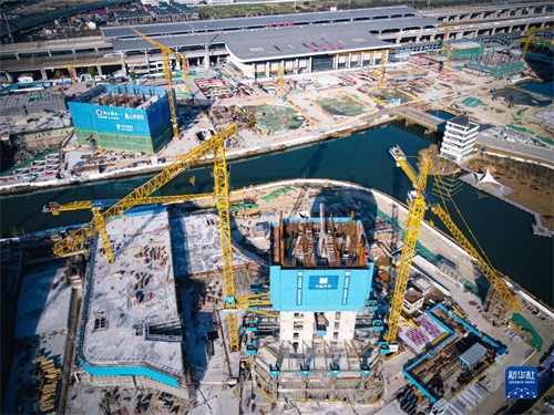 紹興北站TOD綜合交通樞紐工程建設現場(2023年1月31日攝,無人機照片)。由中建三局承建的這項工程為浙江省重點工程,建成后將是集商務辦公、科創研發、星級酒店等多重功能于一體的智慧型城市交通綜合體。新華社記者 江漢 攝