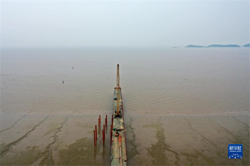 工程人員在通蘇嘉甬高鐵杭州灣跨海鐵路大橋施工現場鋪設棧橋,為后期工程