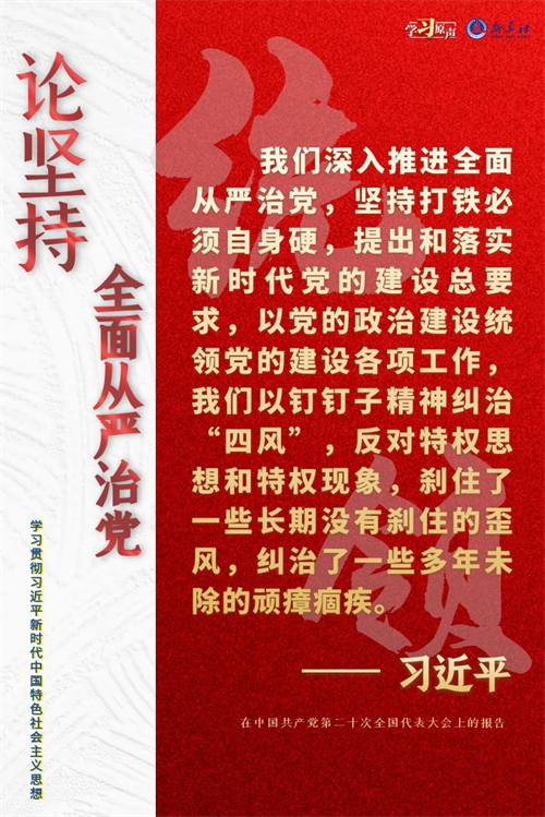 黨的十八大以來,以習近平同志為核心的黨中央把全面從嚴治黨作為新時代黨的建設的鮮明主題,將這一戰略方針貫穿中國特色社會主義事業全過程和黨的建設各方面。