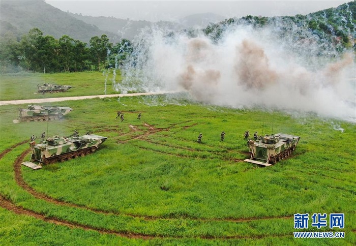 “硬骨頭六連”在訓練場進行戰術訓練,兩棲步戰車發射煙幕彈,掩護步兵突擊(5月27日攝)。新華社發(李彬 攝)