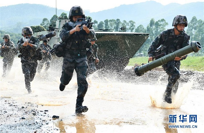 “硬骨頭六連”進行連戰術訓練,官兵們向岸灘發起沖擊(6月1日攝)。新華社記者 張永進 攝