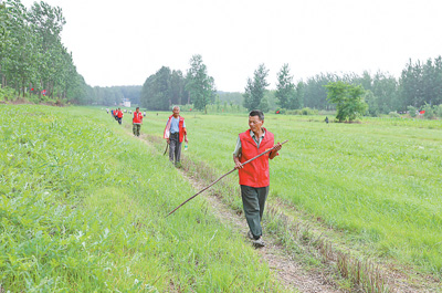 日前,淮河江蘇泗洪段大堤,河道管護人員和當地群眾在巡堤查險。劉成龍攝(影像中國)