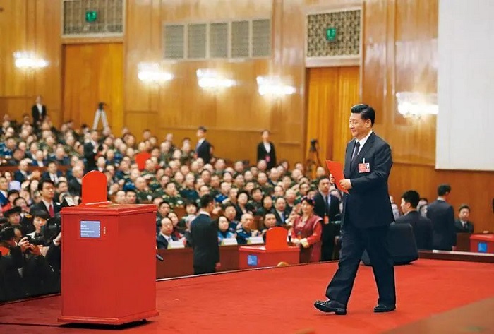 2018年3月17日,十三屆全國人大一次會議在北京人民大會堂舉行第五次全體會議。習近平當選中華人民共和國主席、中華人民共和國中央軍事委員會主席。這是習近平準備投票。 新華社記者 蘭紅光/攝