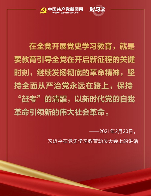 歷史不僅蘊藏著我們“從哪里來”的密碼,也是標定我們“走向何方”的路標。當前,正在全黨集中開展的黨史學習教育,正是為了把黨的歷史學習好、總結好,使我們的黨永遠不變質、我們的紅色江山永遠不變色。