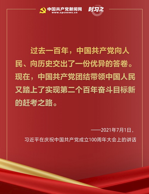 2021年7月,建黨百年的輝煌時刻,習近平總書記在慶祝中國共產黨成立100周年大會上莊嚴宣告,“現在,中國共產黨團結帶領中國人民又踏上了實現第二個百年奮斗目標新的趕考之路。”
