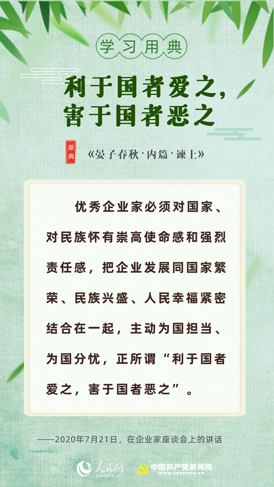 習近平總書記在企業家座談會的講話中,對這句話進行了新的引申。他勉勵廣大企業家要有家國情懷,努力做利于國家的事情,不做不利于國家的事情,把自身事業和祖國的前途命運緊密結合起來。這是新時代的“利于國者愛之,害于國者惡之”。