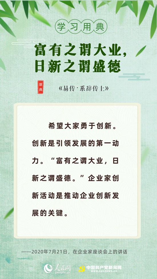 【蒙曼解讀】這句話是對革新的高度贊美。習近平總書記引用這句話既是在表述企業進步和創新之間的關系,也是在講企業家的基本素質。對于企業家而言,企業本身就是“大業”,而企業家要維持發展“大業”,就不能固步自封而是要不斷創新,這種創新意識和創新能力才是企業家的“盛德”。在歷史的長河中,人類是面臨過很多困境的,例如地理、資源、人口等方面,而每次突破困境的都是革新,只有發揚祖先那種“茍日新,日日新,又日新”的創新精神,才能夠在困境中找到出路,這就是習近平總書記所講的“危中有機,唯創新者勝。”