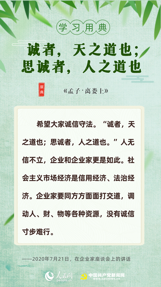 【蒙曼解讀】孟子在表述這句話之后還有一句,“至誠而不動者,未之有也;不誠,未有能動者也。”意思是如果有誠心,對方卻沒被打動,那是不可能的;反之,不誠心當然就打動不了別人。這其實是對誠心效果的最好說明。習近平總書記引用這句話旨在勉勵企業家要誠信守法,遵守契約,賣合格產品、做合法生意,只有“誠”才能取信于人,才能夠形成企業與消費者、企業與企業、企業與社會之間的良性互動,才能夠把事業越做越大,乃至于帶動整個社會風氣的良性發展。