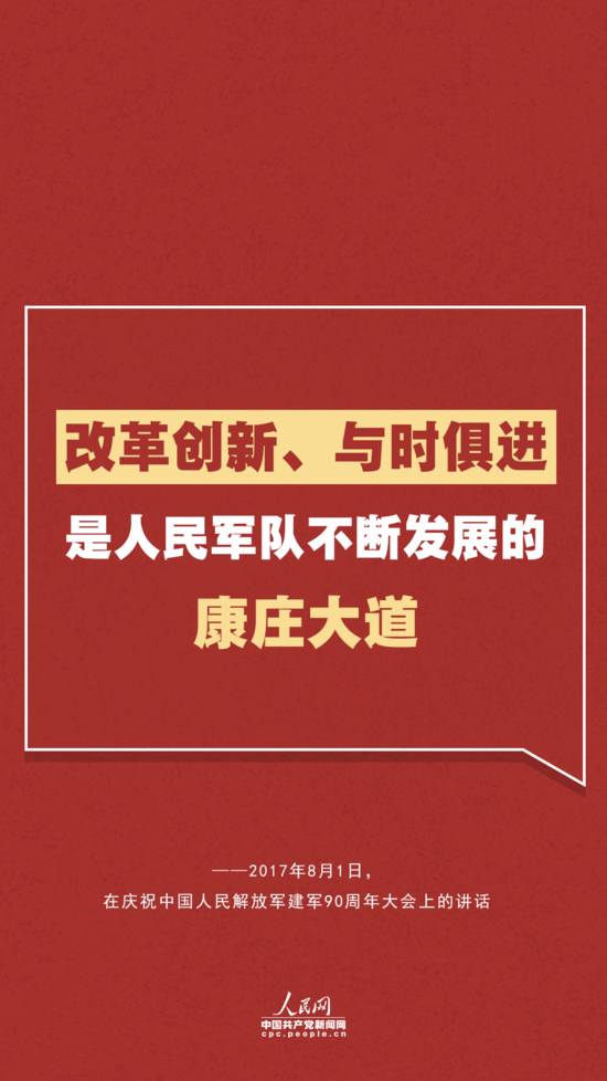改革創新、與時俱進,是人民軍隊不斷發展的康莊大道,人民軍隊的力量來自改革創新,人民軍隊的勝利來自改革創新。只有不斷改革創新,才能不斷獲得發展進步的生機活力,才能永遠立于不敗之地。前進道路上,人民軍隊必須勇于改革、善于創新,任何時候任何情況下都永不僵化、永不停滯。