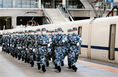 2020年2月17日,軍隊增派支援武漢抗擊新冠肺炎疫情的又一批1200名醫(yī)務人員,分別通過航空和鐵路輸送抵達武漢。圖為醫(yī)療隊員抵達武漢漢口火車站后軍容嚴整地走出車站。 解放軍報記者 王傳順/攝