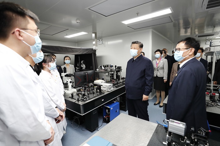 4月19日,在清華大學建校110周年校慶日即將來臨之際,中共中央總書記、國家主席、中央軍委主席習近平來到清華大學考察。這是習近平在清華大學成像與智能技術實驗室,結合展板、電子屏幕察看實驗室開展計算光學、腦科學與人工智能交叉科學實驗研究和開發新科技應用場景情況,聽取實驗室理論研究、技術攻關、成果轉化應用等情況介紹。新華社記者 鞠鵬 攝