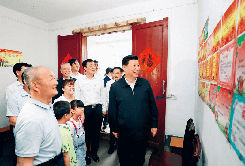 2019年9月16日至18日,中共中央總書記、國家主席、中央軍委主席習近平在河南考察。這是16日下午,習近平在信陽市新縣田鋪鄉田鋪大塆“老家寒舍”民宿店,同店主一家親切交談。新華社記者 謝環馳/攝