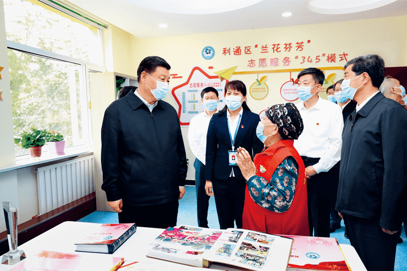 2020年6月8日至10日,中共中央總書記、國家主席、中央軍委主席習近平在寧夏考察。這是6月8日下午,習近平在吳忠市利通區金花園社區黨群活動服務中心,同社區志愿者代表親切交談。新華社記者 鞠鵬/攝