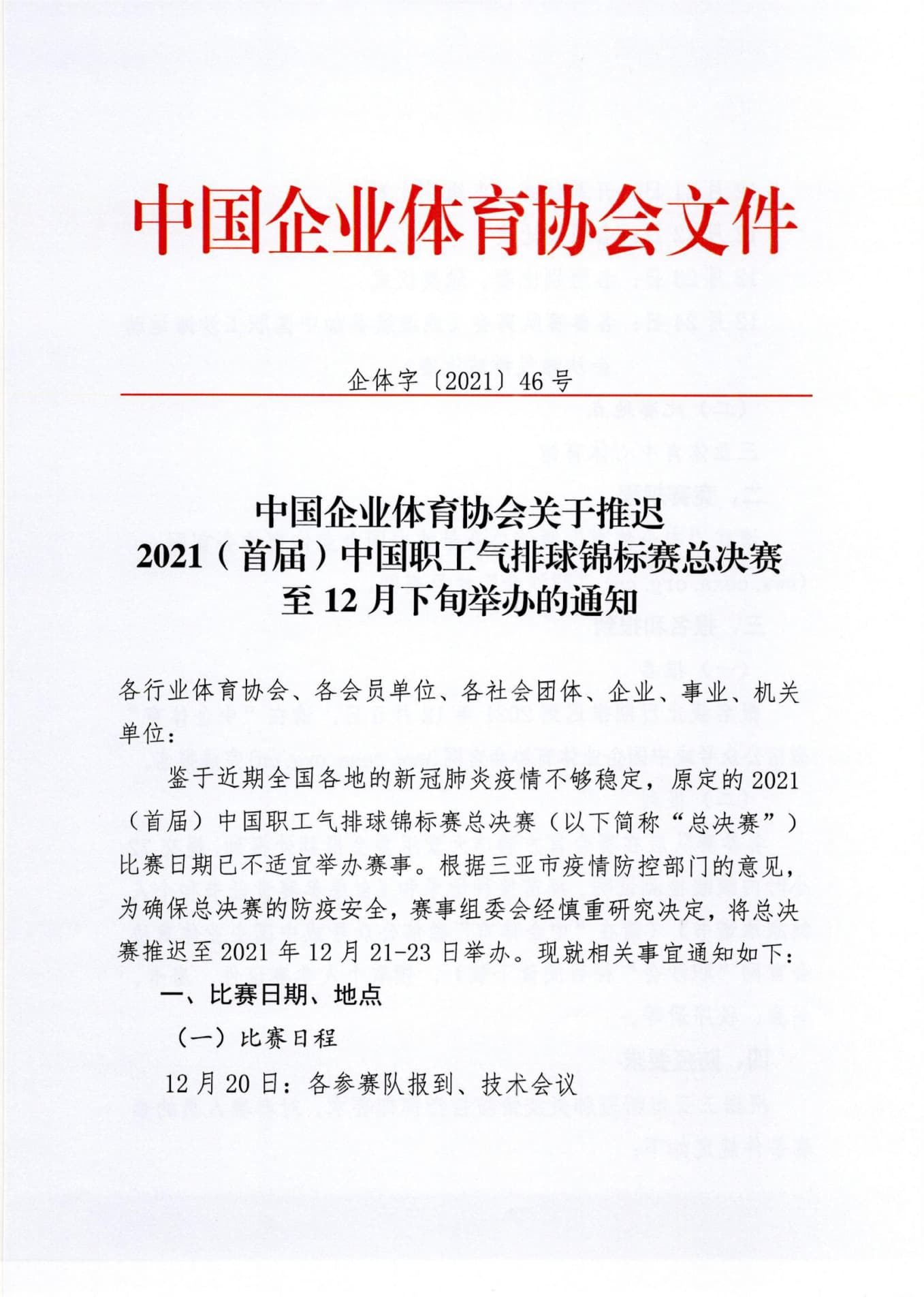 中國企業體育協會關于推遲2021(首屆)職工氣排球錦標賽總決賽至12月下旬舉辦的通知