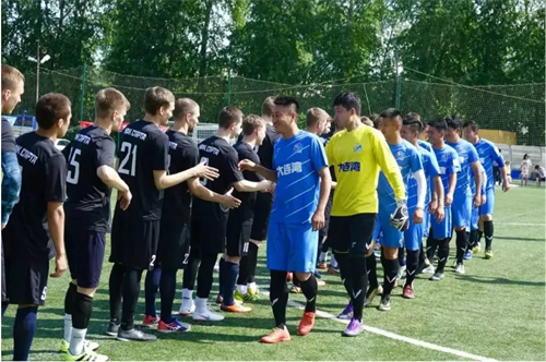 大連灣足球隊(duì)與烏拉爾重型機(jī)械廠職工隊(duì)賽前握手