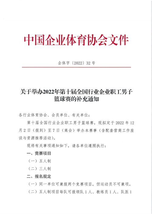 關(guān)于舉辦2022年第十屆全國行業(yè)企業(yè)職工男子籃球賽的補(bǔ)充通知