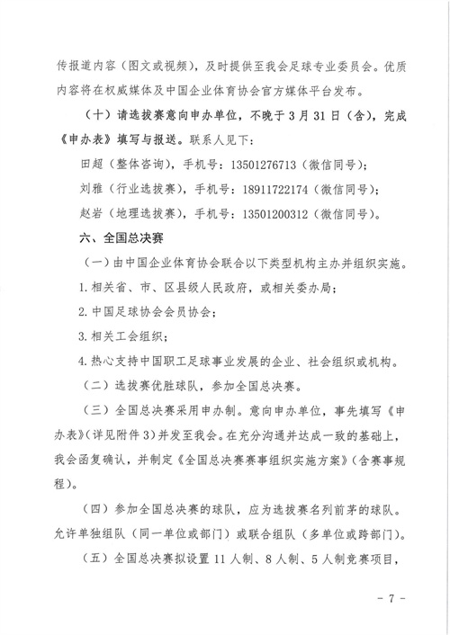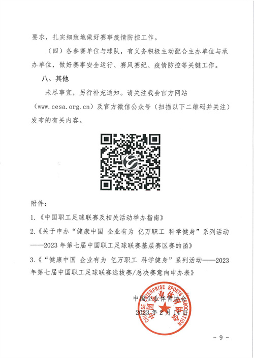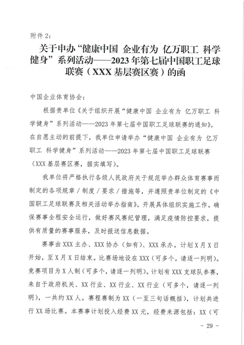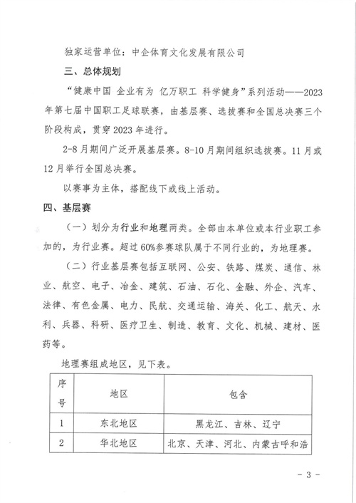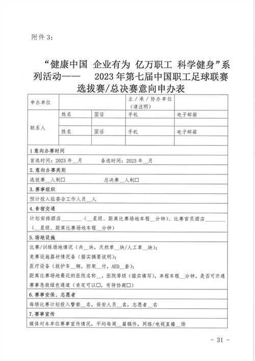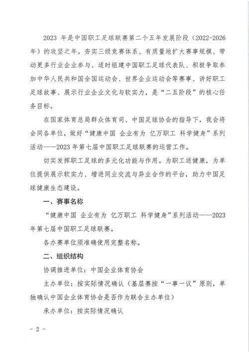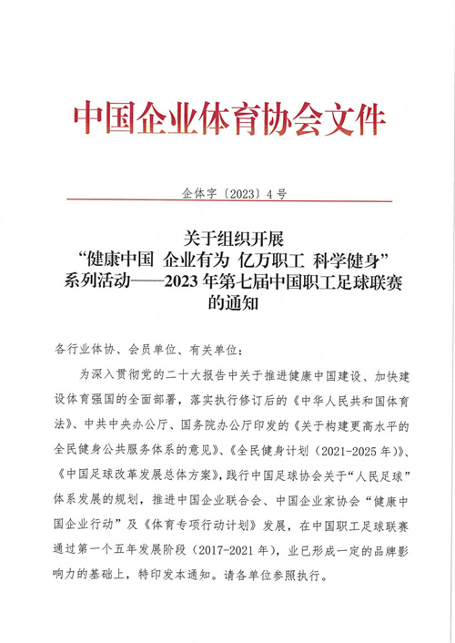 關(guān)于組織開(kāi)展“健康中國(guó) 企業(yè)有為 億萬(wàn)職工 科學(xué)健身”系列活動(dòng)——2023年第七屆中國(guó)職工足球聯(lián)賽的通知