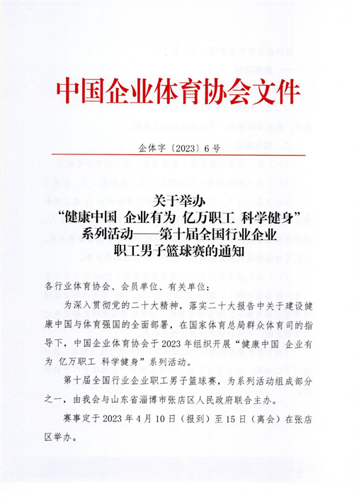 關(guān)于舉辦“健康中國(guó) 企業(yè)有為 億萬(wàn)職工 科學(xué)健身”系列活動(dòng)——第十屆全國(guó)行業(yè)企業(yè)職工男子籃球賽的通知