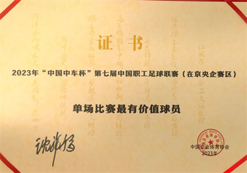 單場比賽最有價值球員的證書設計,也別出心裁。背景上印有一首《江城子·職工足球感懷》。“場上奔襲血脈張,鬢微霜,又何妨”,道的是精氣神。“揮汗如雨嘯長天,英雄氣,震四方”,講的是大氣魄。短短數語,職工足球文化躍然紙上。詞作者?中國中車副總裁余衛平帶領的工作團隊。