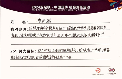 “教練,以后我要認真聽你講話”、“盧同學,希望你守門越來越厲害,希望我考上好初中,射門更加有力”、“2025年我要踢好球的同時,成績考進全年級前二十名”……一條條寄語樸實無華,但飽含著學員、家長、教練對足球運動的純粹與熱忱。