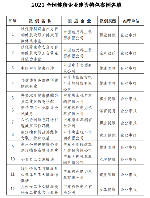 中車已有15家子公司獲評省市“健康企業”榮譽稱號,9項健康企業案例被國家衛健委評為“健康企業建設優秀案例-企業建設篇”,14項健康企業管理案例被中國企聯評為“全國健康企業建設特色案例”。