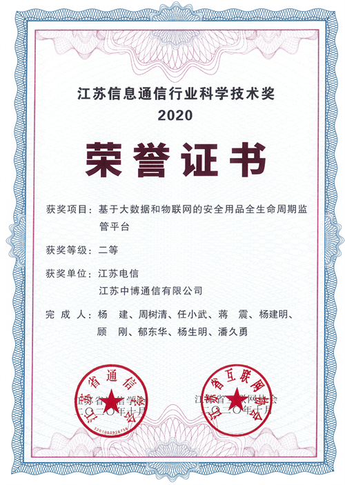 中國電信江蘇公司個人勞動保護用品的全生命周期監管項目自2019年開始試點實施并投入應用,目前已完成3.2萬頂安全帽、12.3萬雙絕緣鞋、2.01萬條安全帶、1.2萬副腳扣、1200具絕緣梯的全生命周期監管工作,累計發生合同費用1700余萬元。2019年以來,發送臨期更換預警信息8900條,依標定期檢測信息326條,到期回收報廢預警信息7434條。平臺服務企業開展自主產品質量檢測108批次,共檢測各類勞動保護用品448件。《基于大數據和物聯網的安全用品全生命周期監管平臺》獲得了2020年度江蘇省信息通信行業科學技術二等獎。