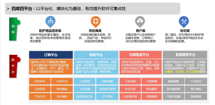 全生命周期監管平臺使用二維碼和RFID等技術對個人勞動保護用品做唯一標識。建立了勞動保護用品信息庫、供應商庫、客戶庫、標識庫和訂購平臺、質檢平臺、倉儲物流平臺、監督管理平臺(四庫四平臺)。