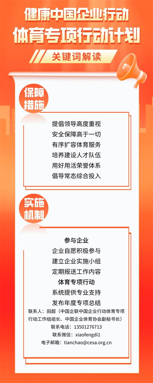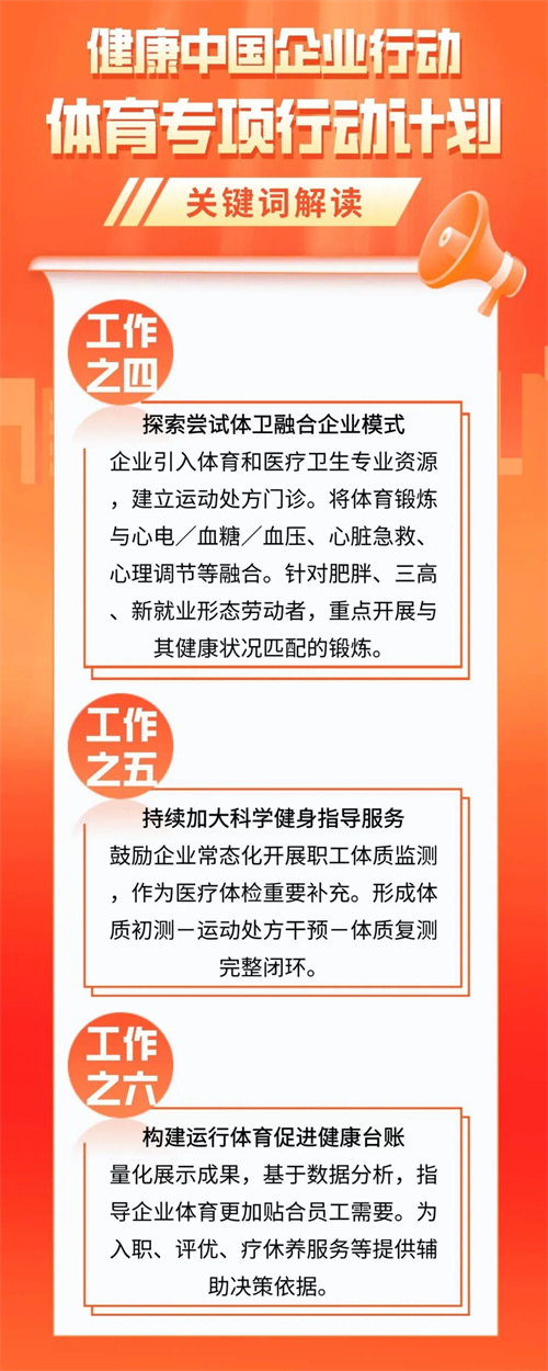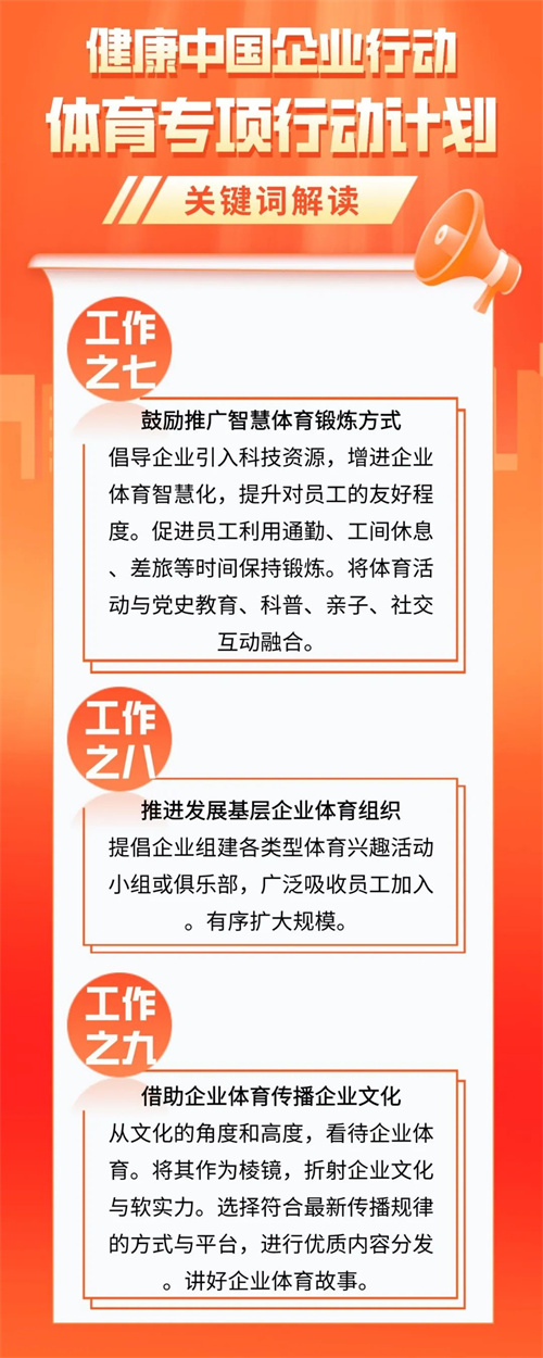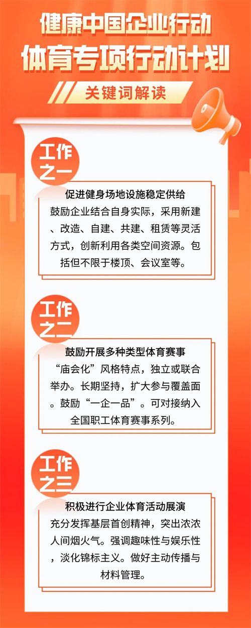 伴隨《體育專項行動計劃》的推出,企業(yè)在開展體育工作、促進人員健康、助力健康中國建設(shè)方面,將獲得更多的方向性指導(dǎo)與建議性措施,并可結(jié)合自身實際情況,酌情參考與采納。
