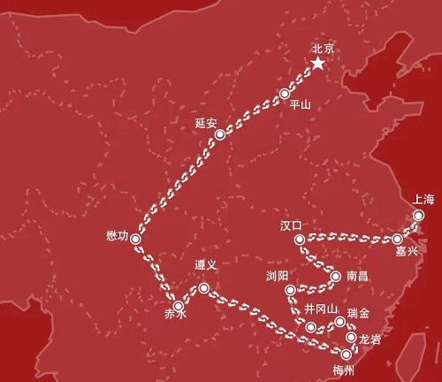設置線上紅色之旅,將中國共產(chǎn)黨歷屆黨代會會址(在莫斯科舉行的六大除外)及部分紅軍長征路,組成路線圖。起點為上海,終點為北京,涵蓋浙江、湖北、江西、湖南等省份和具體城市,總里程為1萬公里。